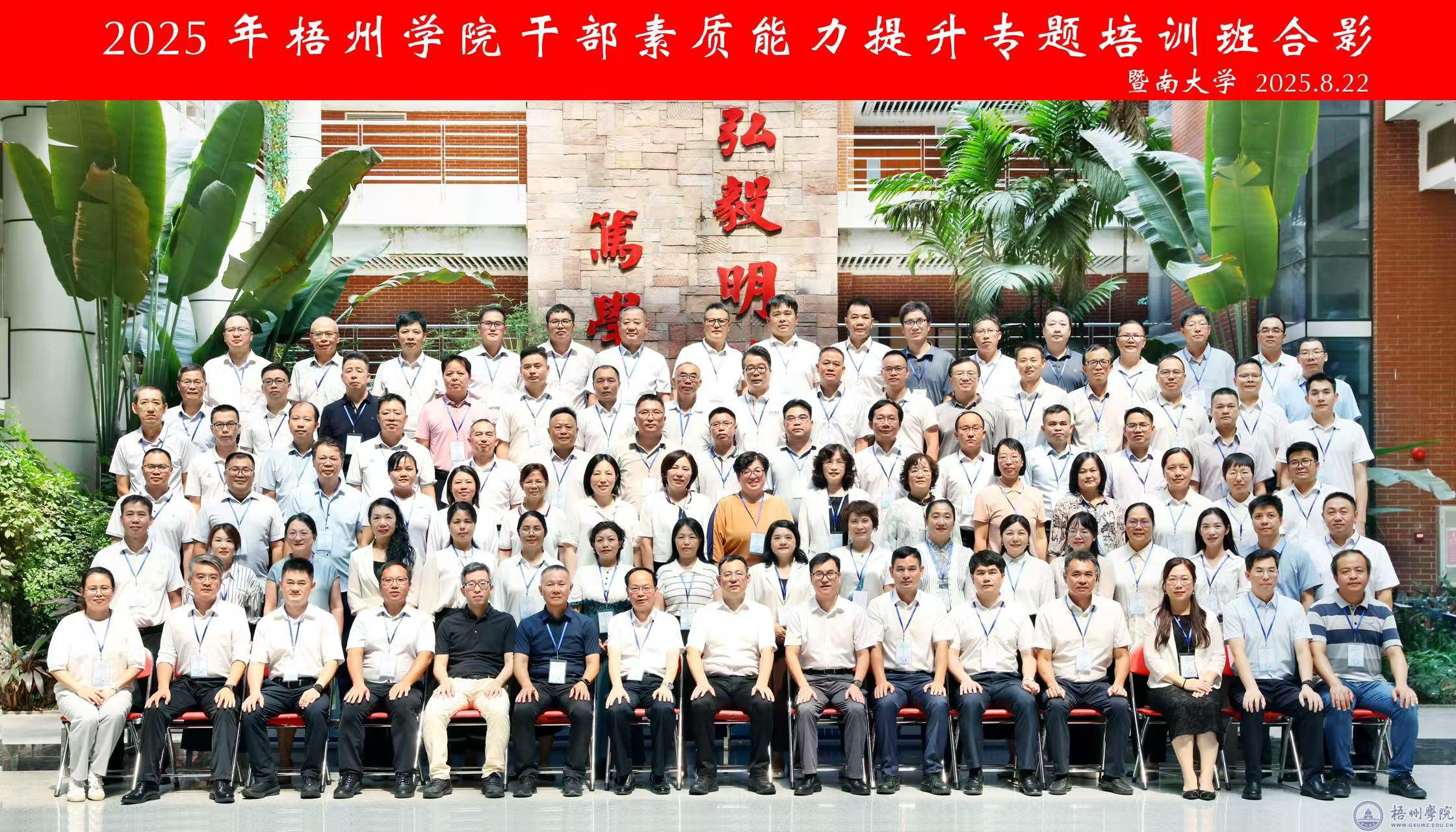 为进一步落实学校重点领域改革工作要求,贯彻新发展理念,提升学校干部管理能力和战略规划能力,学校于8月22日—26日在暨南大学举办2025年干部素质能力提升专题培训班。全体学校领导、中层干部参加培训班学习。